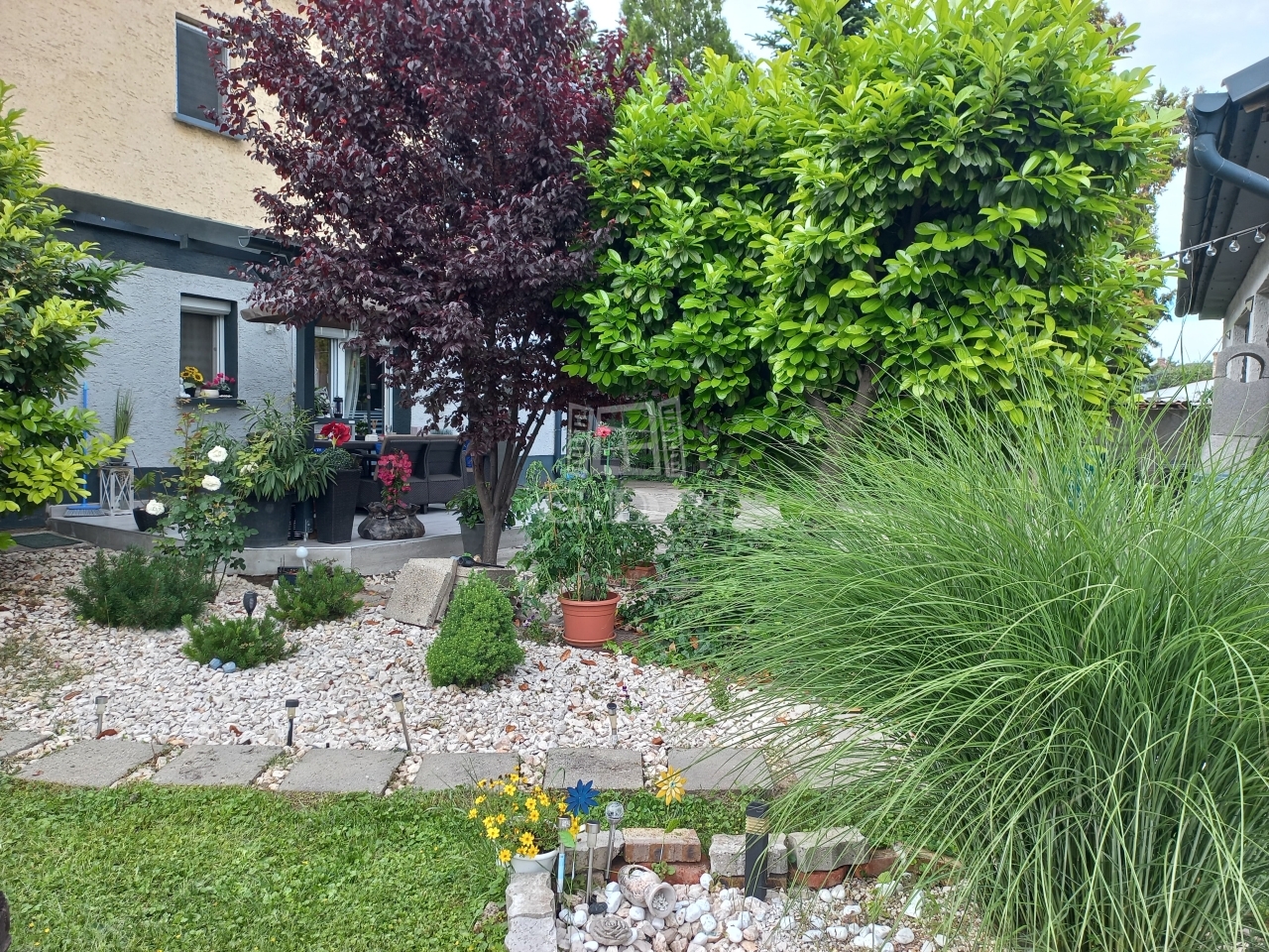 A gondozott udvar gyepesített, díszcserjékkel, diófával és gyümölcsfákkal tele, az öntözést pedig saját fúrt kút biztosítja – minimális költséggel.