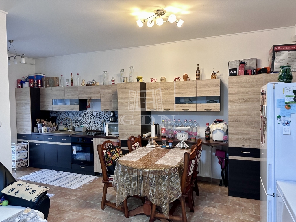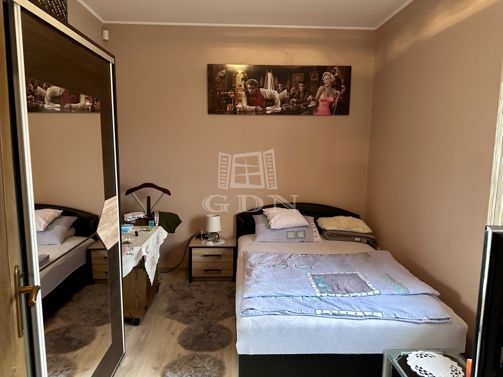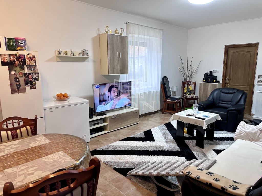 A riasztóval felszerelt házba belépve, kis előtérbe érkezünk, melyből nyílik, egy nagy, amerikai konyhás nappali, valamint 2 szoba, a fürdőszoba és a wc külön helyiségben.